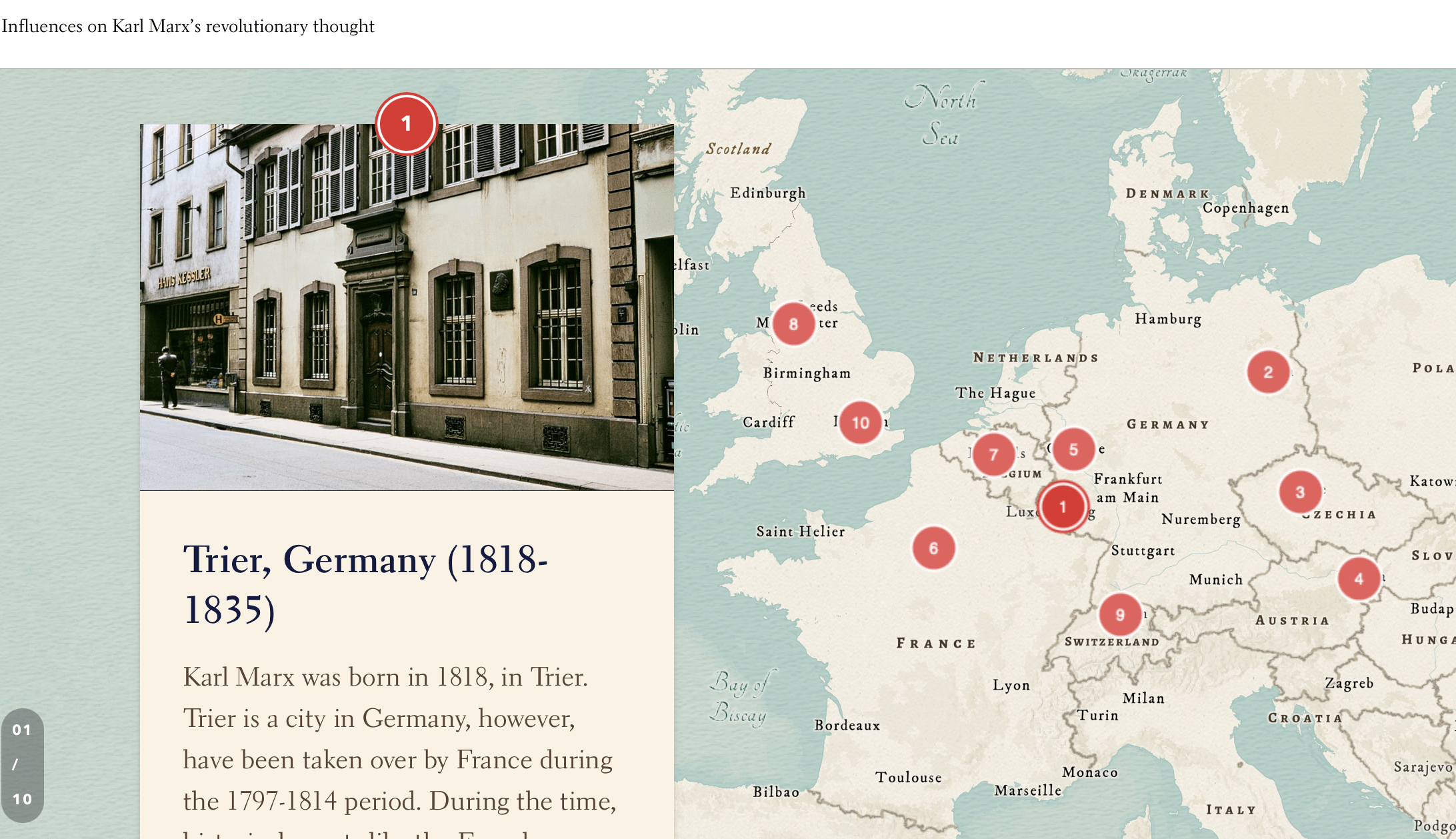n this digital map, we aim to explore the life and ideas of Karl Marx, with a specific focus on ten locations which are closely related to Marx’s work. The locations include Trier, Berlin, Prague,